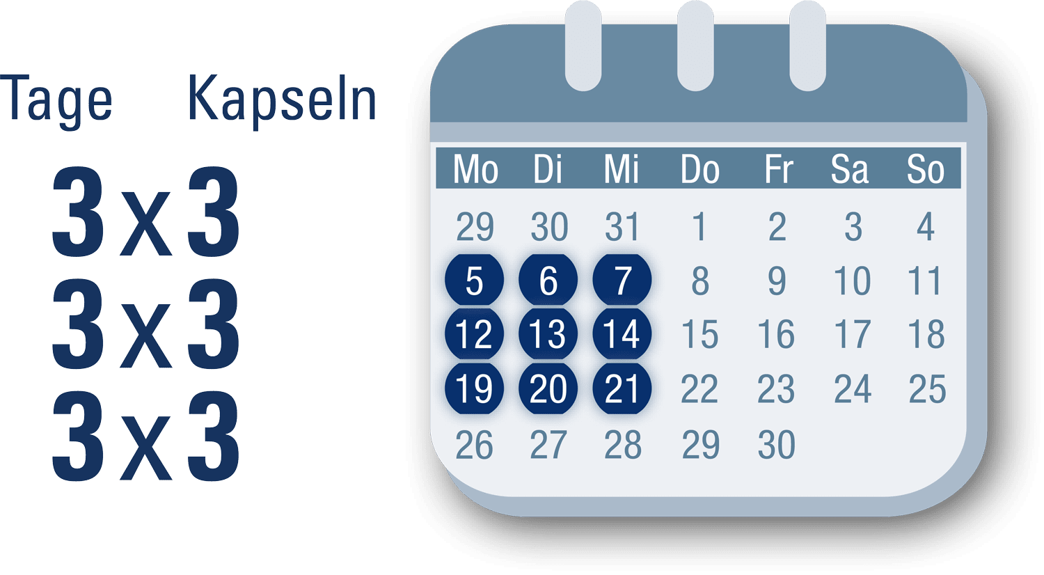 Für Erwachsene: 1 x täglich 3 Kapseln unzerkaut mit ausreichend Flüssigkeit zu einer Mahlzeit (morgens, mittags oder abends) verzehren, über die Dauer von 3 Tagen (3-Tageszyklus mit insgesamt 9 Kapseln = 1 Zyklus). Im Abstand von einer Woche für mindestens 3 Zyklen wiederholen.