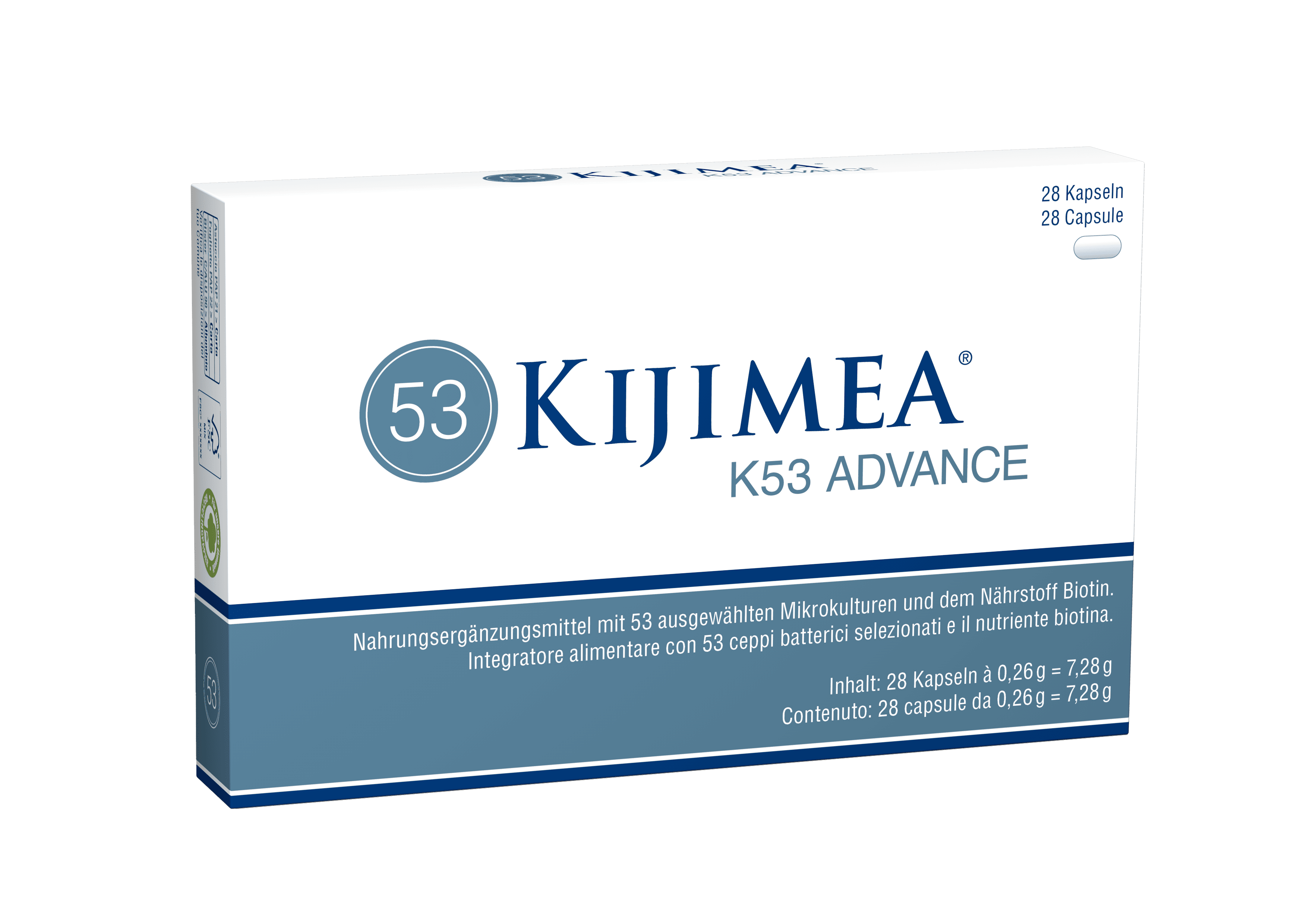Kijimea® K53 Advance ist ein Nahrungsergänzungsmittel mit 53 ausgewählten Mikrokulturenstämmen und dem Nährstoff Biotin.